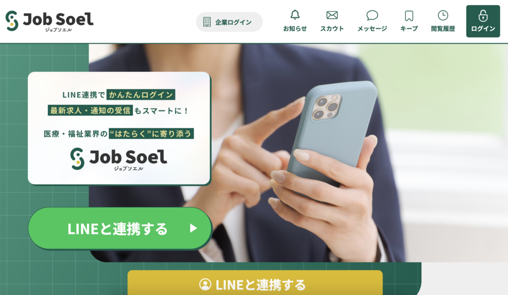 ジョブソエルは2025年開始の医療・福祉向け転職サイトで、スカウトやLINE連携、チャットでのやり取りなど自分のペースで進めやすい点が魅力です。