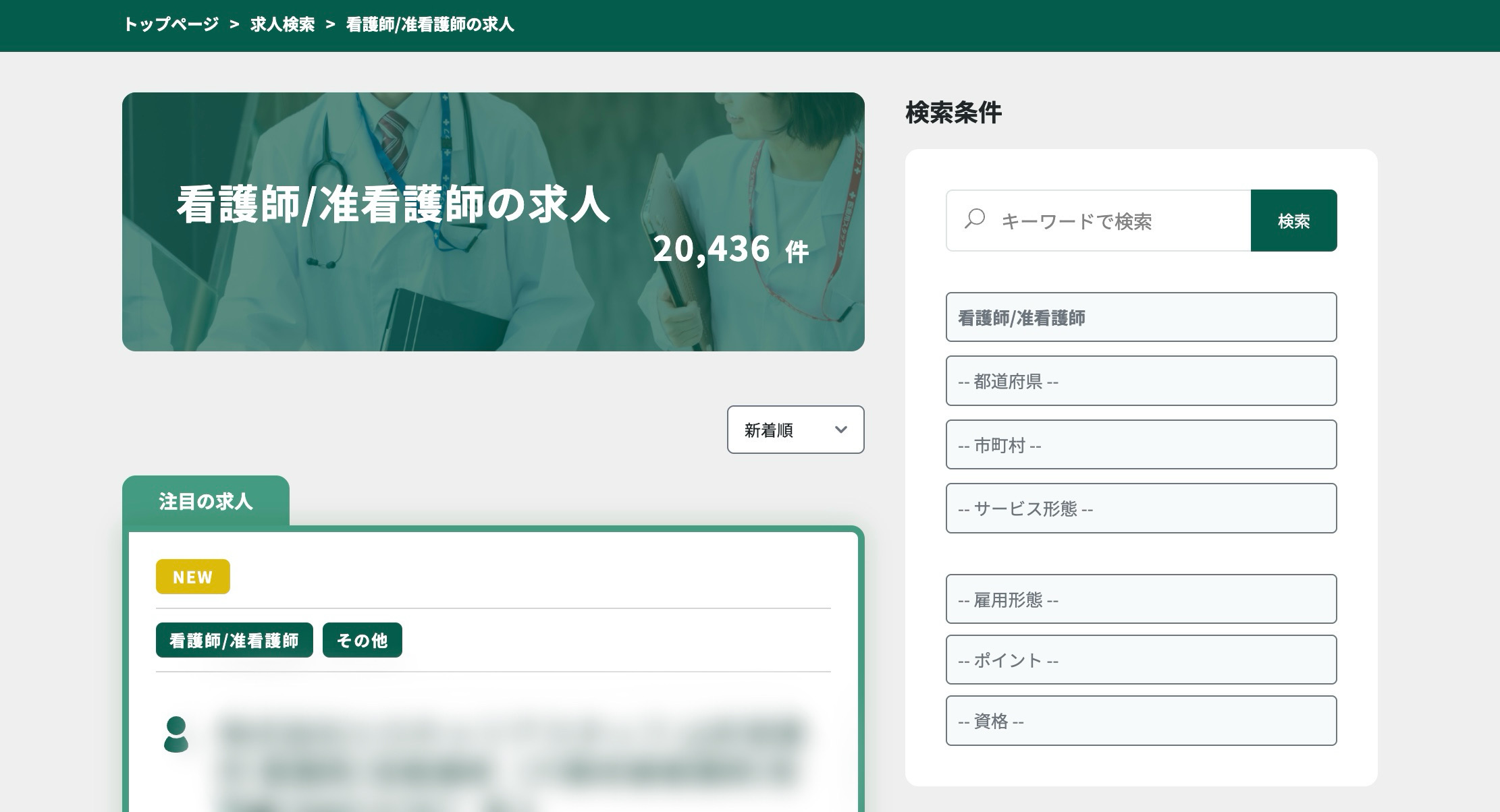 - 病院以外にトラベルナースや企業看護師の求人が豊富