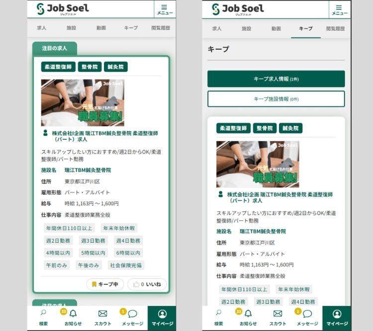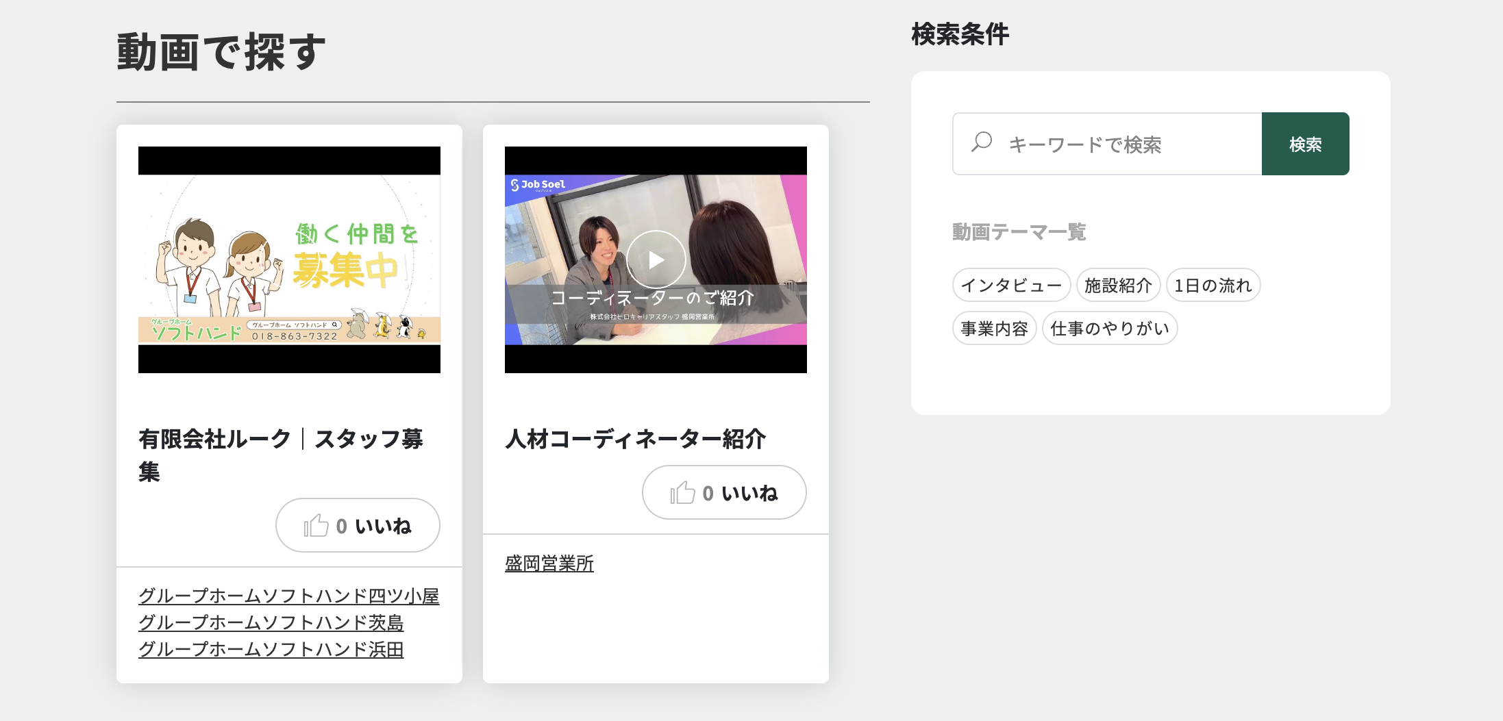 ジョブソエルではトップページから施設紹介動画を閲覧できるため、応募前に施設の雰囲気をイメージしやすく、安心材料になります。