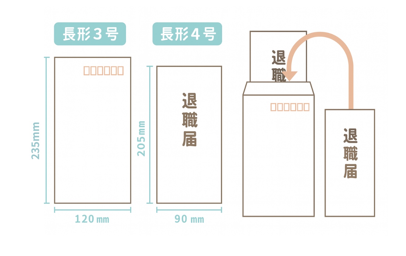 退職願・退職届は基本的には手渡しですが、郵送する場合は便箋を「退職願」「退職届」と記載した長形4号の封筒に入れて、さらに長形3号の封筒に入れます。